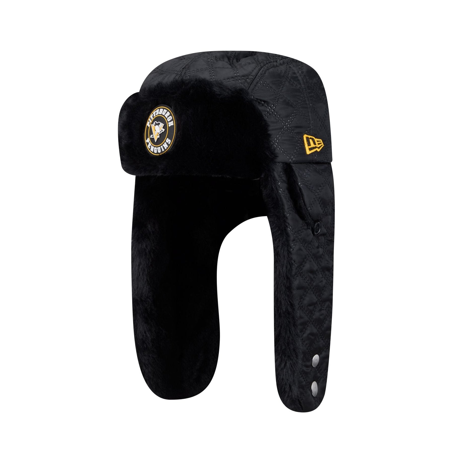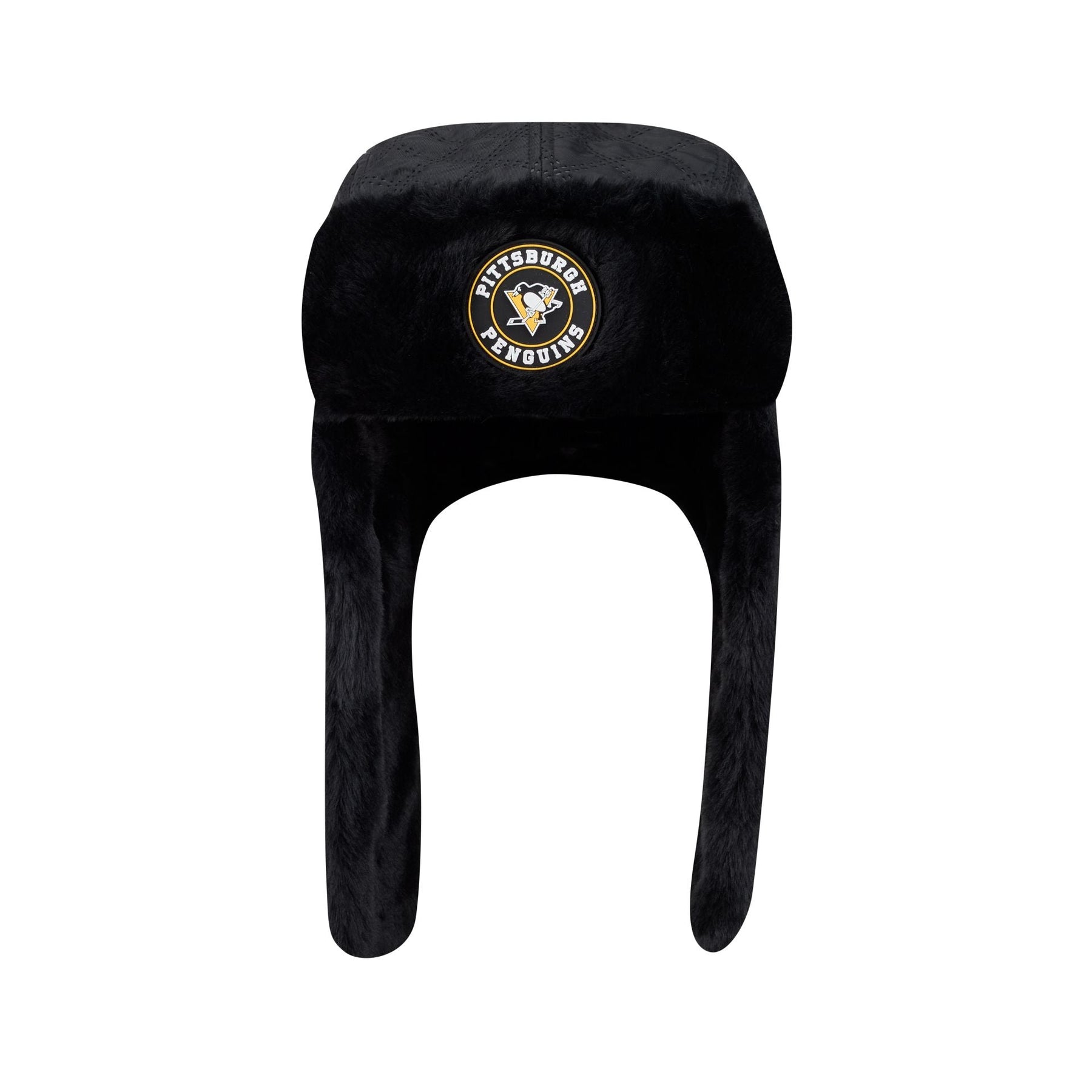 The Boston Bruins Quilted Fashion Trapper features a silicone Bruins circle logo at a faux fur shield with snap dog ears. Additional details include a faux fur interior and a quilted stitching.