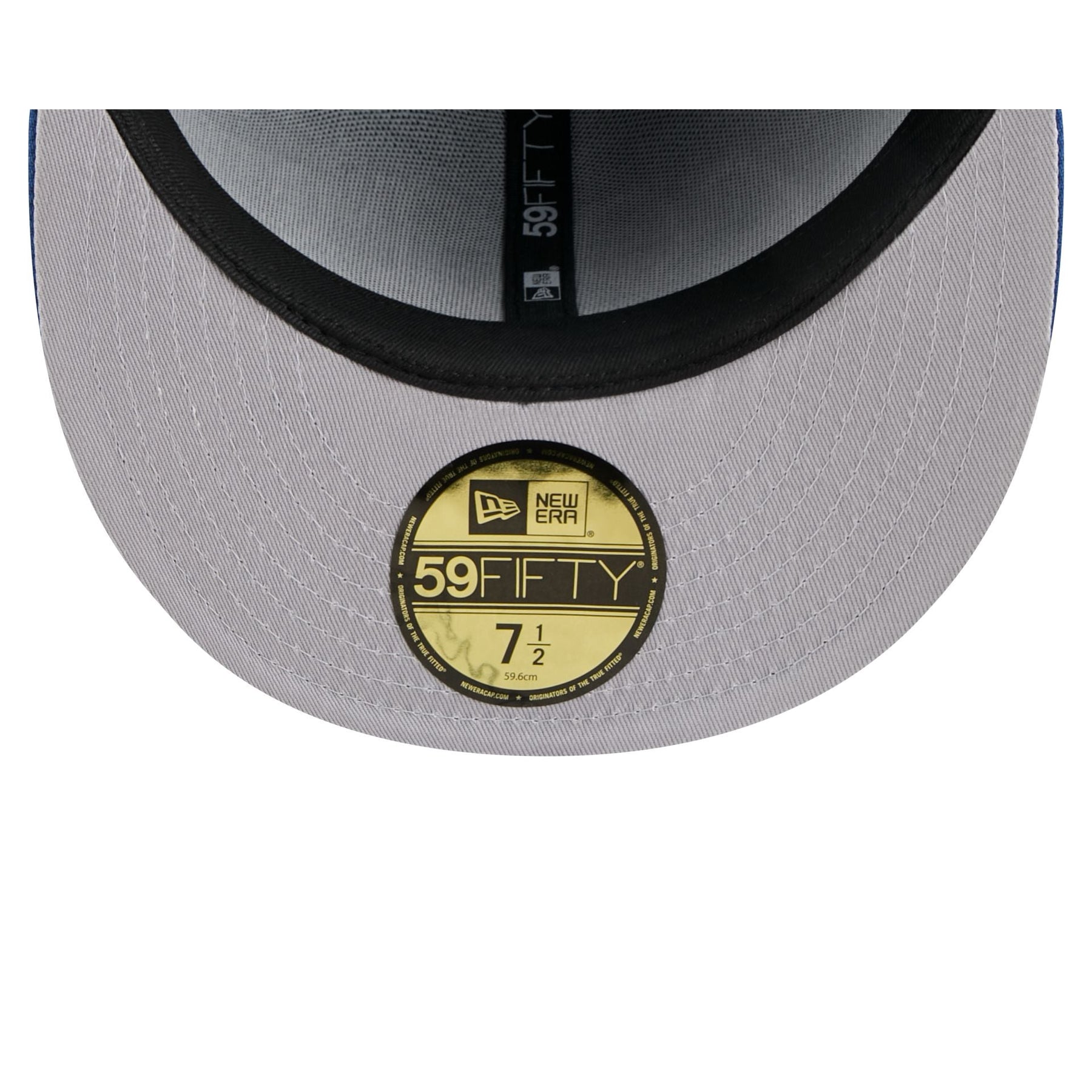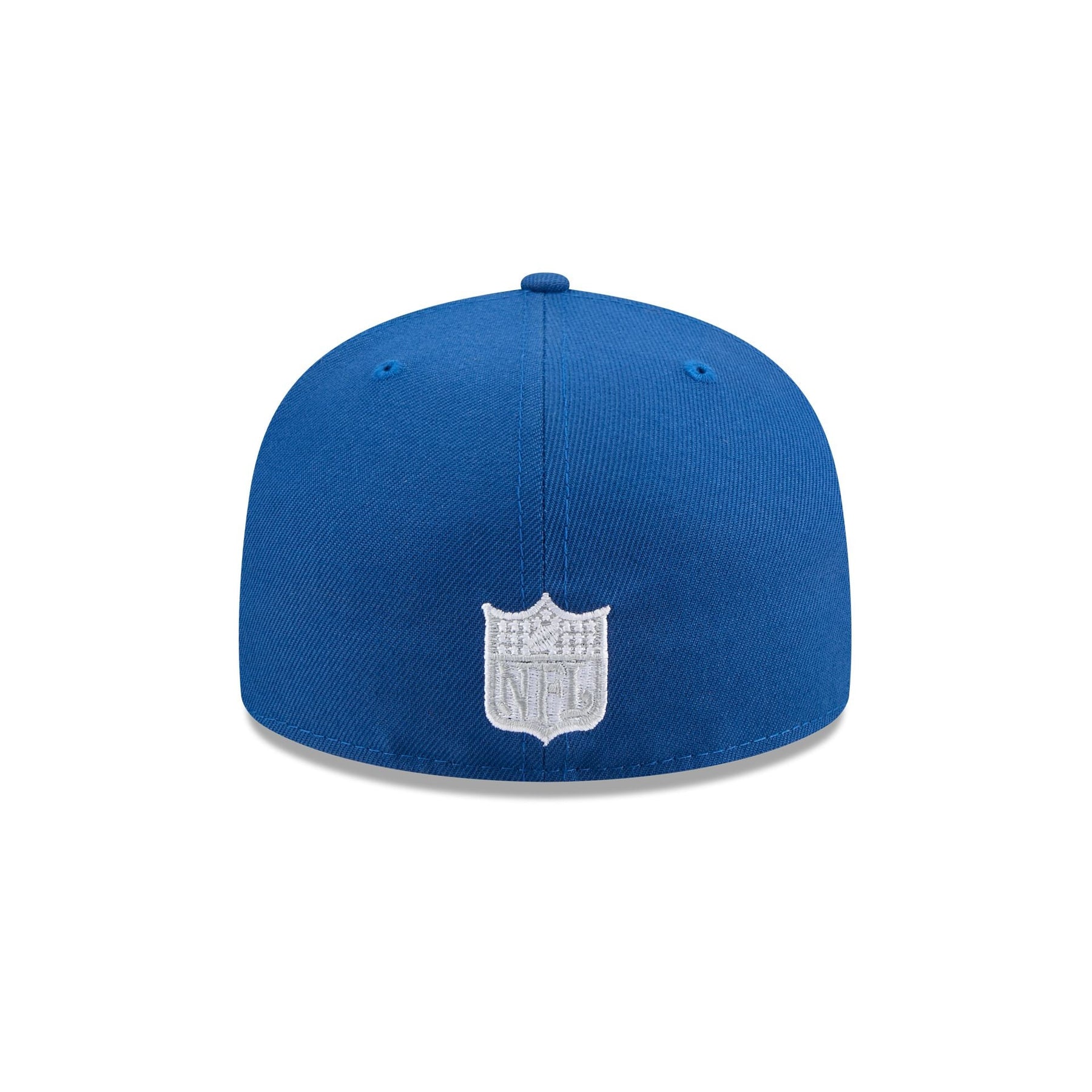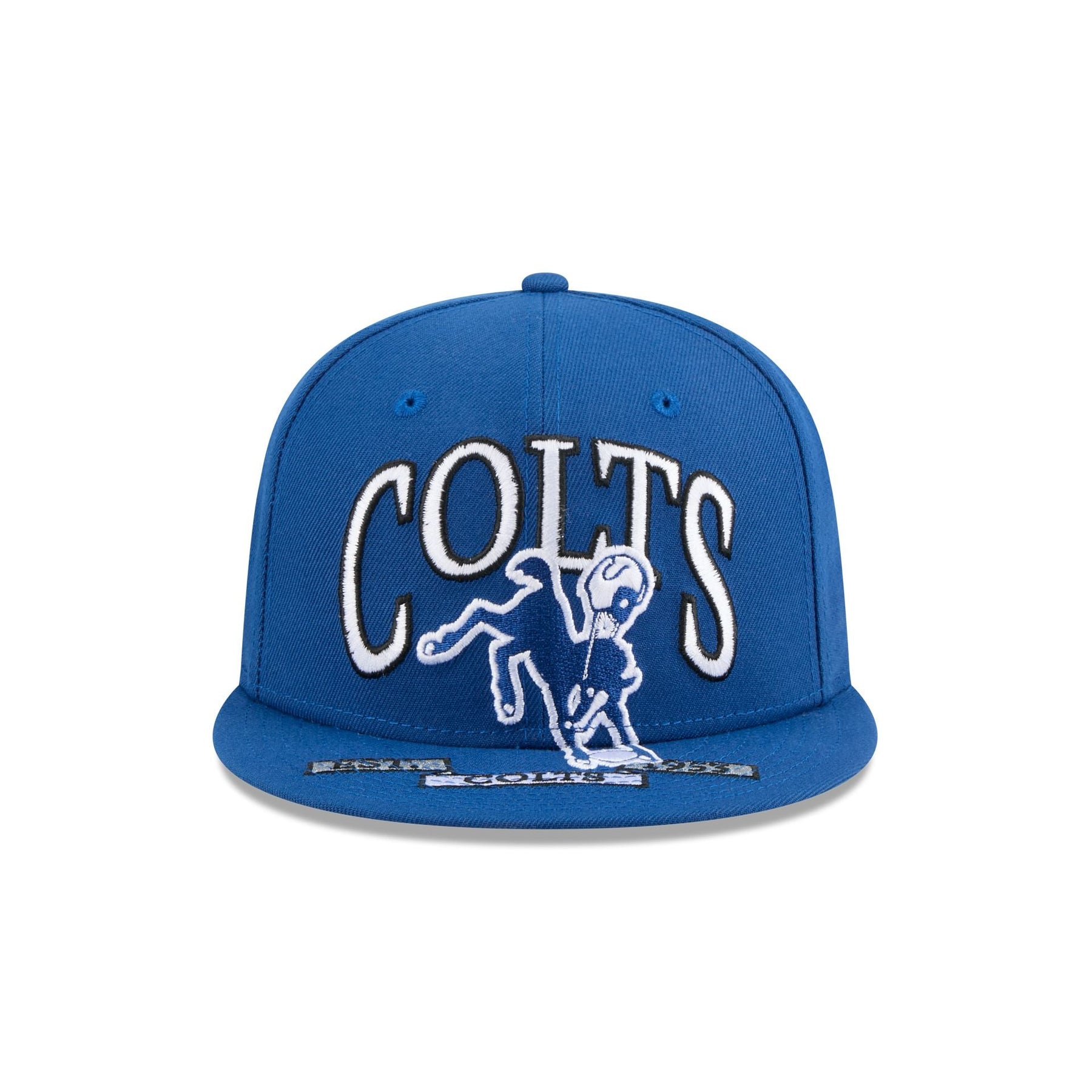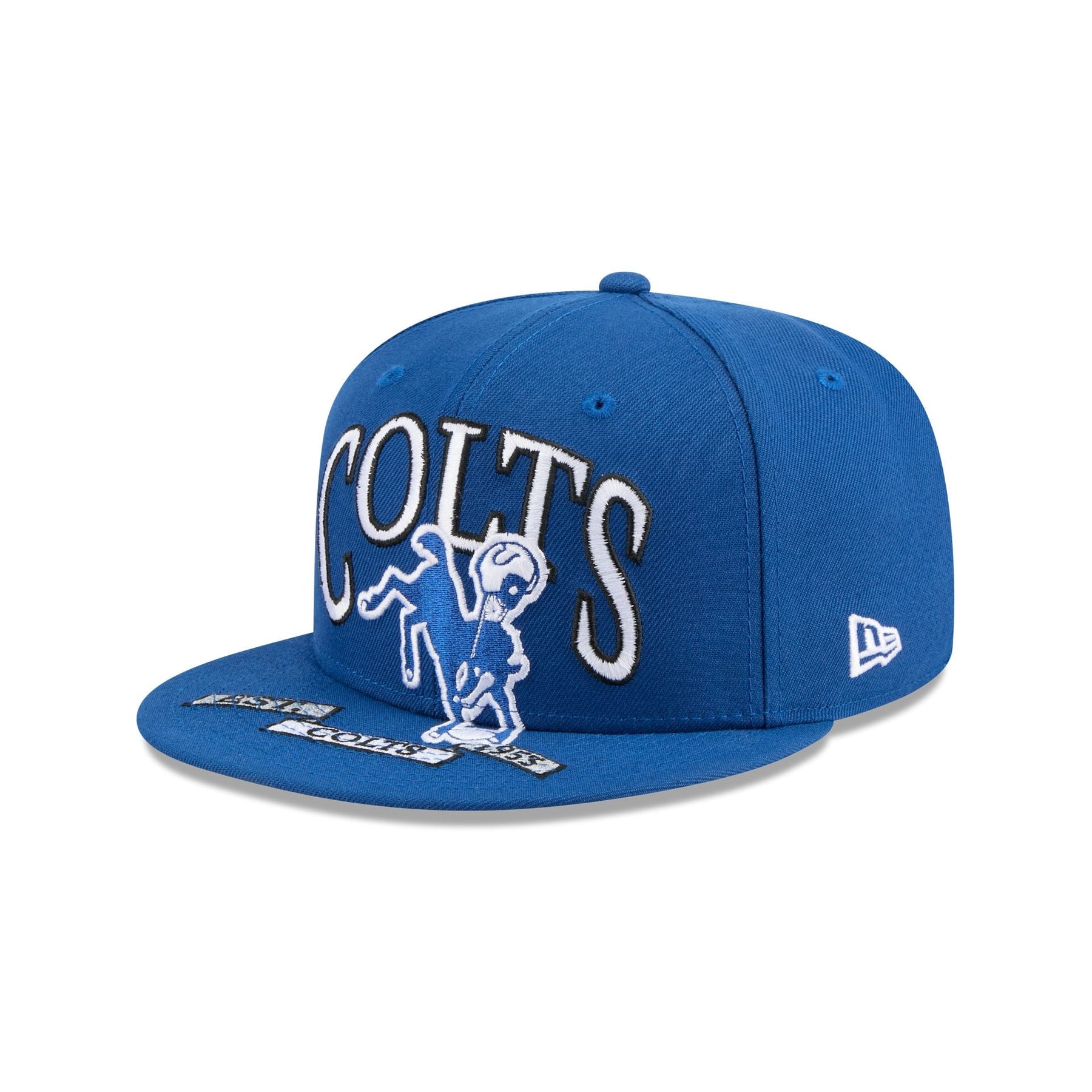 The Indianapolis Colts Oversized 59FIFTY Fitted Cap features an embroidered Colts Historic oversized graphic at the front panels and visor. Additional details include a logo at the right-wear side, an NFL Shield logo at the rear, and a gray undervisor.