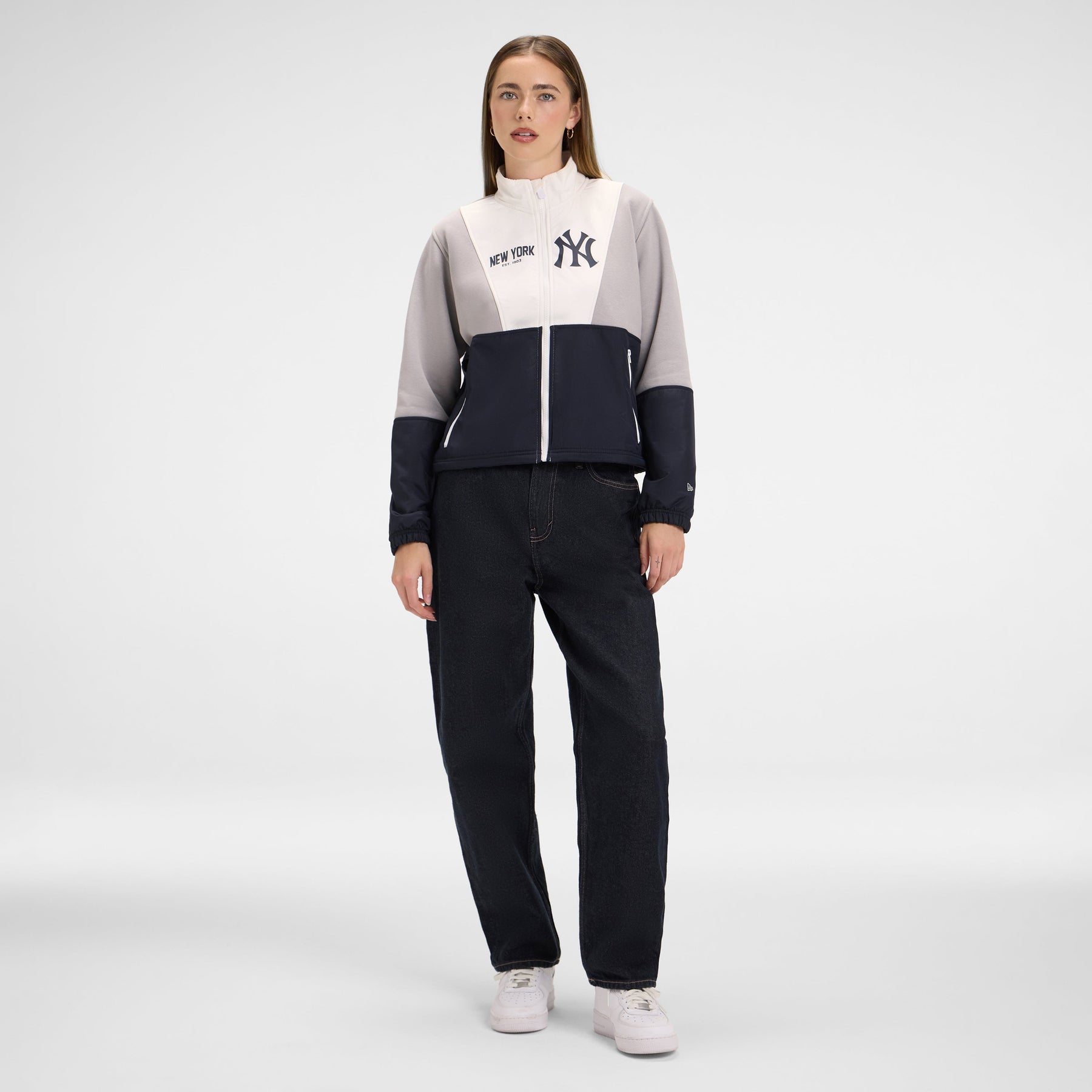 The Los Angeles Dodgers Leisure Women's Full-Zip Sweatshirt features a screen-printed Dodgers logo at the left chest and wordmark at the right. Additional details include a zipper closure, zipper pockets, and adjustable drawstrings at the waist.