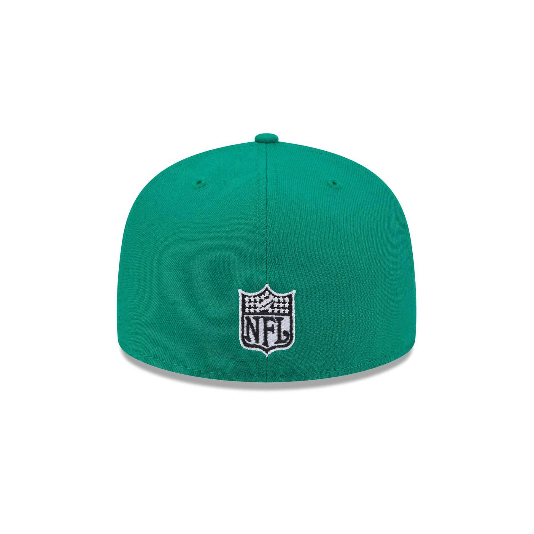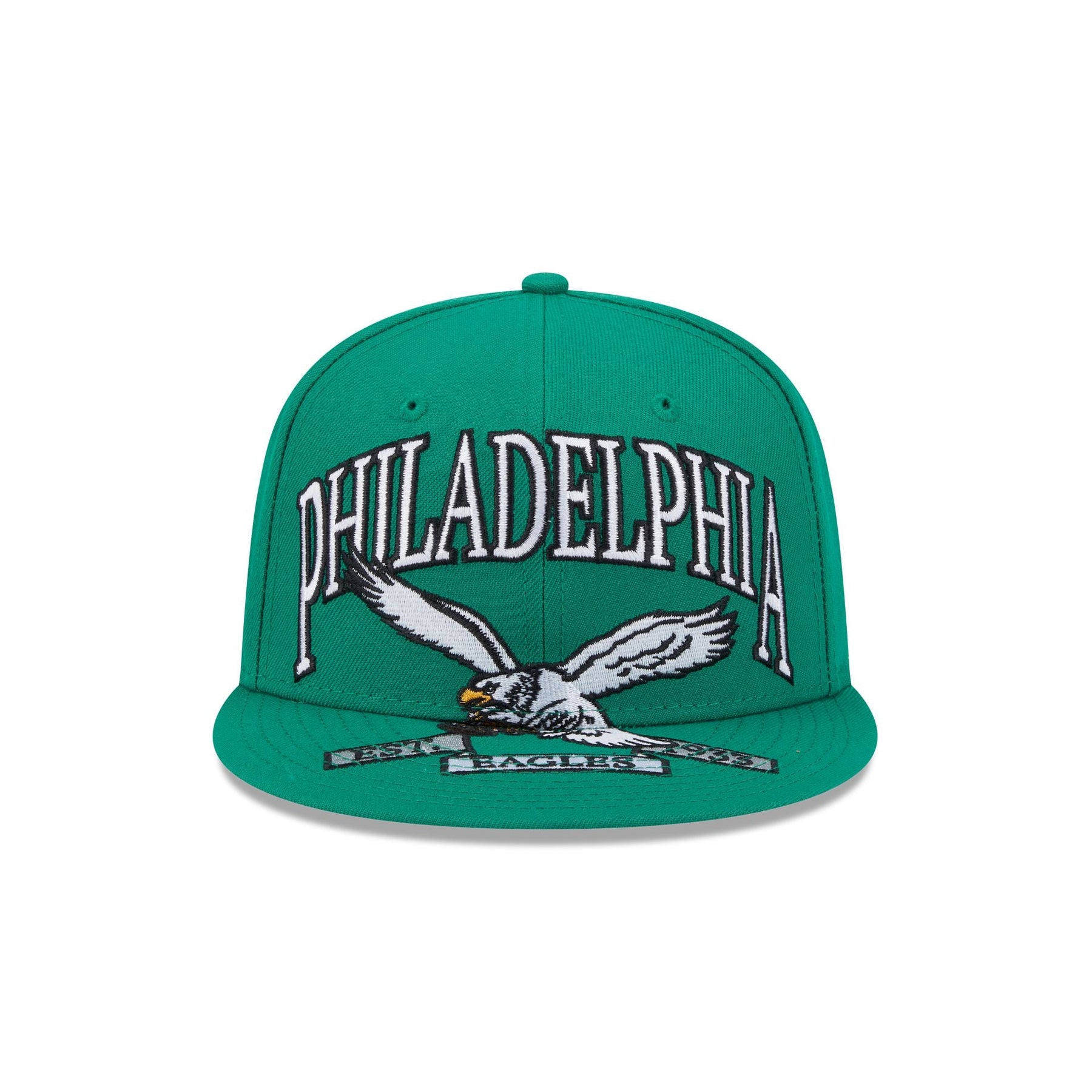 The Philadelphia Eagles Oversized 59FIFTY Fitted Cap features an embroidered Eagles Historic oversized graphic at the front panels and visor. Additional details include a logo at the right-wear side, an NFL Shield logo at the rear, and a gray undervisor.