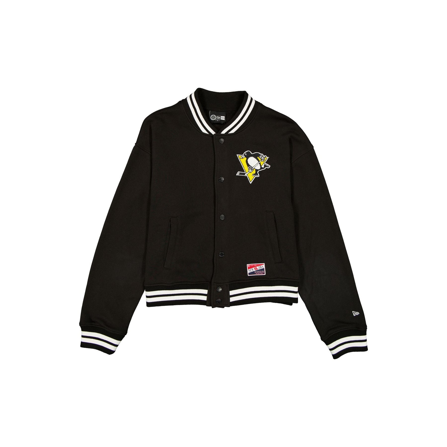 The Pittsburgh Penguins Throwback Women's Snap Front Jacket features a chenille Penguins logo at the left chest a snap button closure and front pockets.