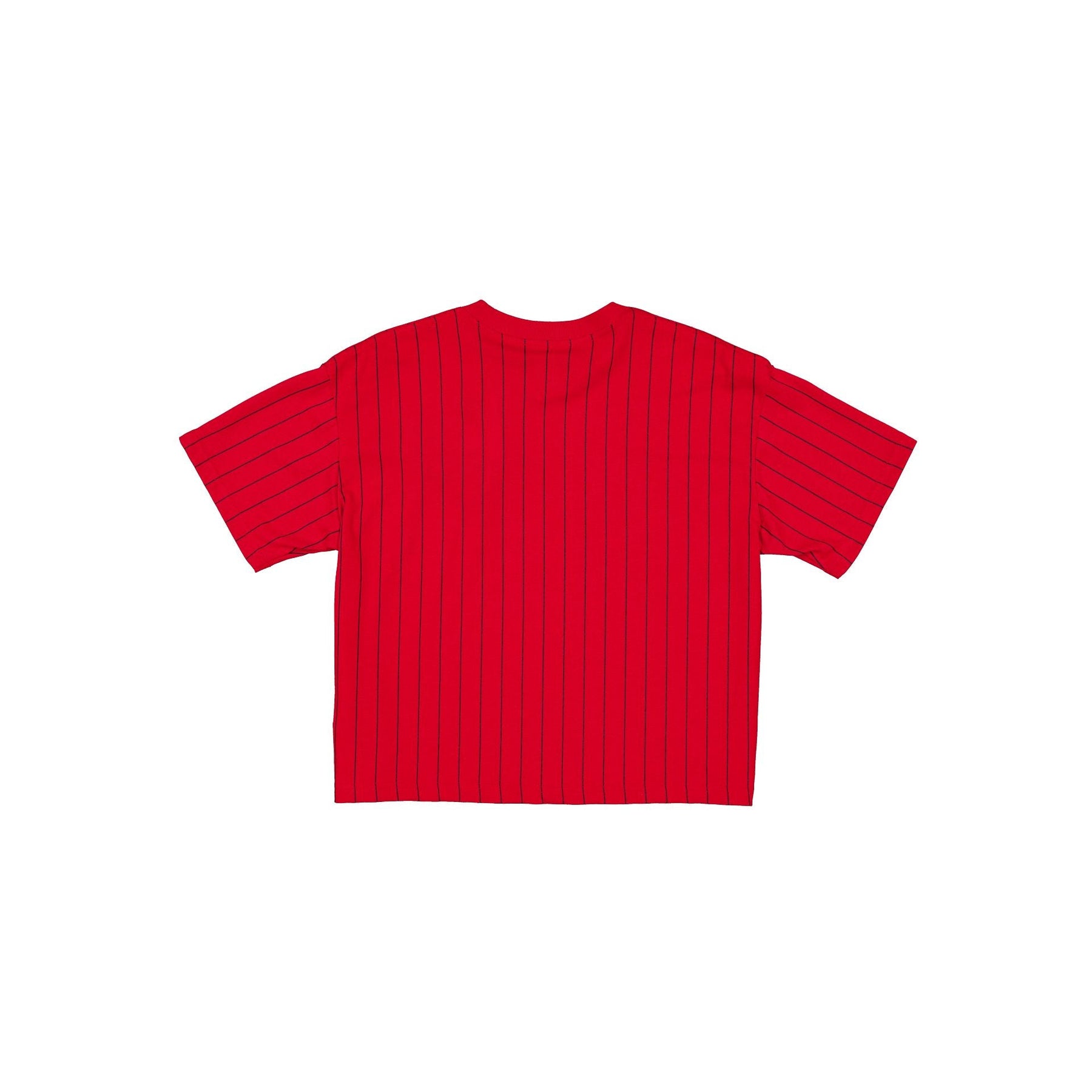 The San Francisco 49ers Throwback Women's Cropped Pinstripe T-Shirt features an embroidered 49ers logo at the left chest.