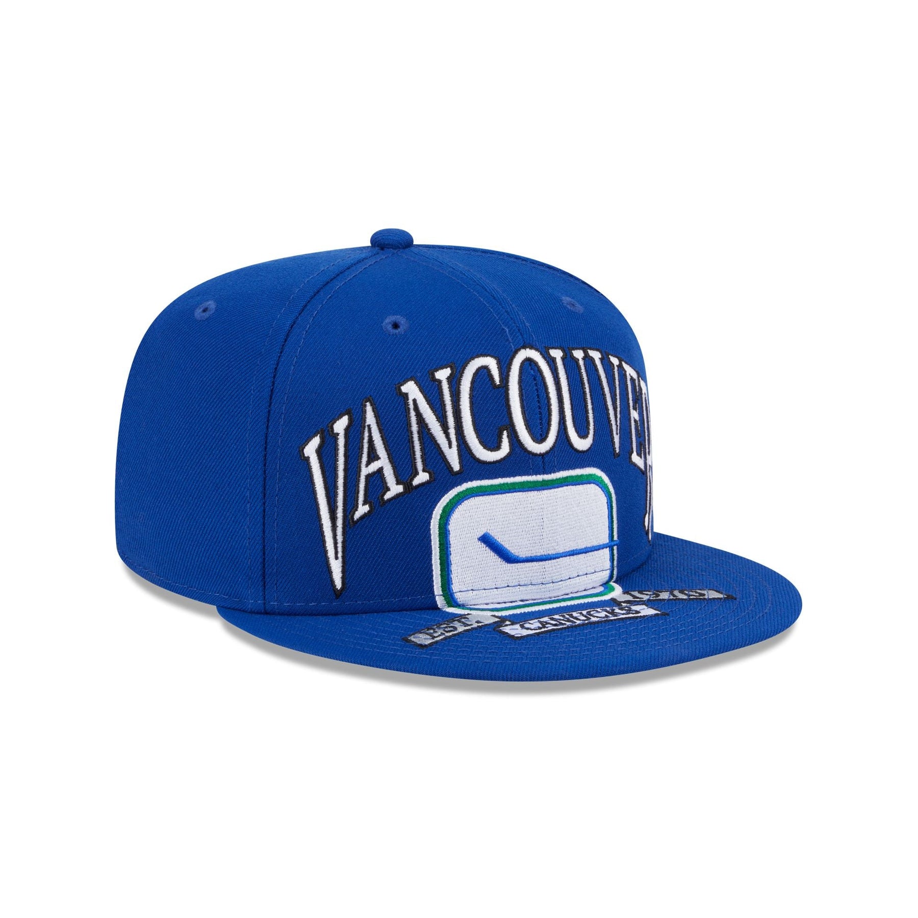The Vancouver Canucks Oversized 59FIFTY Fitted Cap features an embroidered Canucks Historic oversized graphic at the front panels and visor. Additional details include an NHL Shield logo at the rear and a gray undervisor.