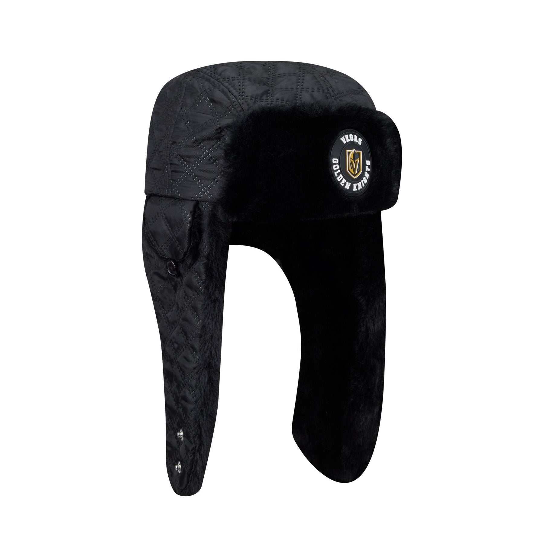 The Vegas Golden Knights Quilted Fashion Trapper features a silicone Golden Knights circle logo at a faux fur shield with snap dog ears. Additional details include a faux fur interior and a quilted stitching.